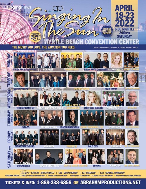 "We can't wait for Singing In The Sun 2022," said Ray Flynn, president of Abraham Productions. "After having to alter our plans last year, we are excited to welcome our friends back to Myrtle Beach, SC for a wonderful time of music and ministry."