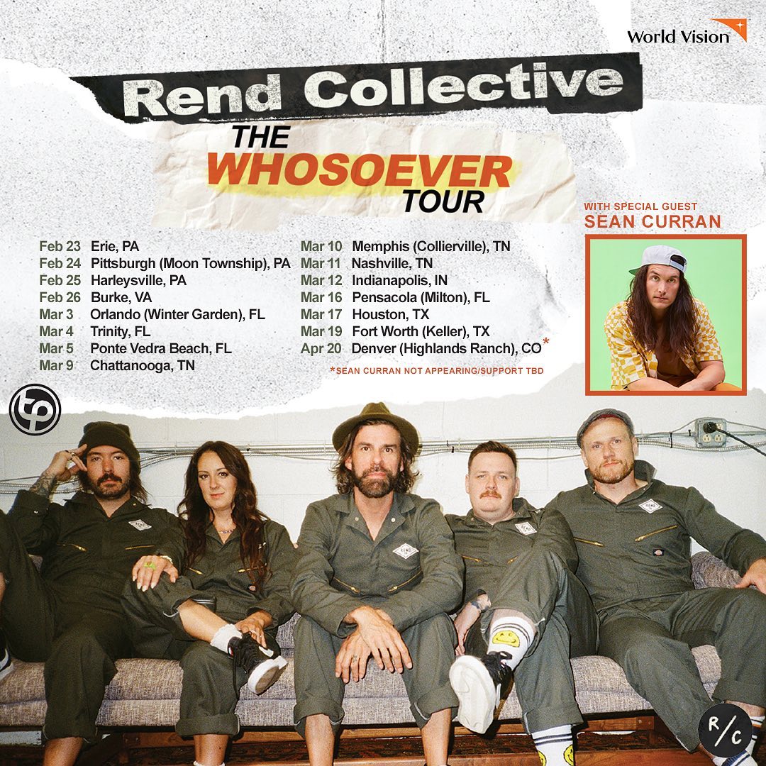 "The Whosoever Tour is returning this spring, and we're bringing Sean Curran with us," Rend Collective posted on Facebook. "Grab a pair of tickets for you and a friend that needs to hear about joy and hope."
