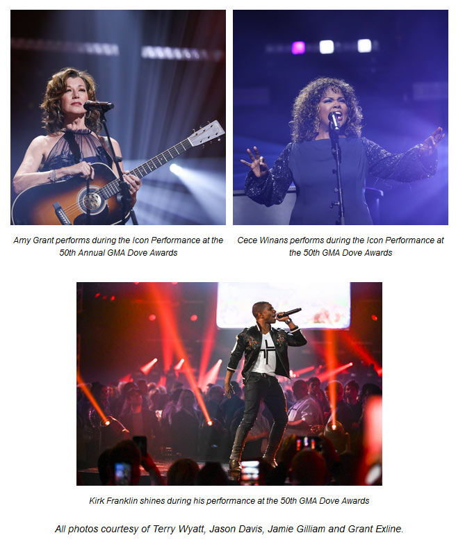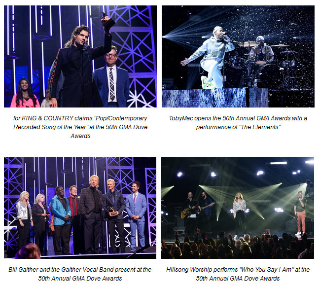 The Gospel Music Association celebrated the 50th Annual Dove Awards with a sold out crowd in Nashville, TN. The special evening shined a light on Christian and Gospel music's rich and diverse history and showcased the future of exceptional artistry. The awards will be televised on TBN (Trinity Broadcasting Network) on Sunday, October 20 at 8 p.m. EST / 5 p.m. PST.