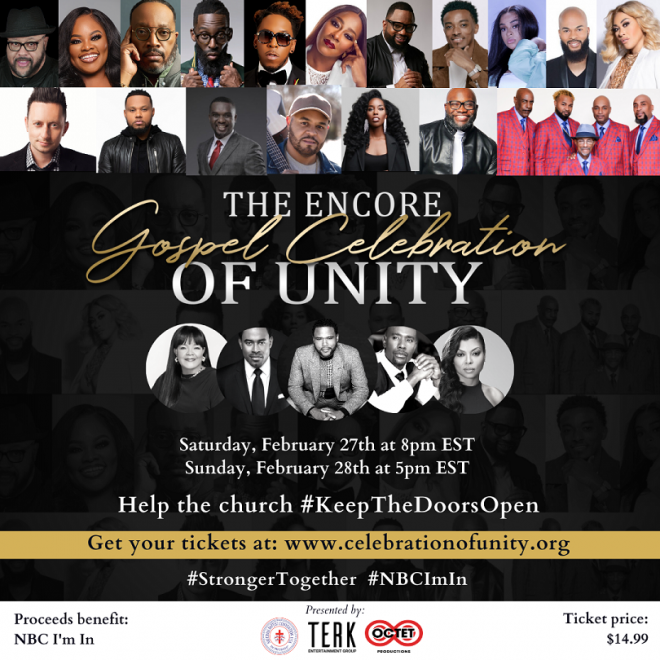 Get a front-row seat to The Encore Gospel Celebration of Unity Friday, February 27th beginning at 8pm EST and streaming thru Sunday, February 28th. Reserve your ticket now for this special global streaming event - based in Washington, D.C. and filmed in COVID-Compliant locations across the world by going to www.celebrationofunity.org ($14.99), with proceeds benefiting the National Baptist Convention's "I'M IN" initiative.