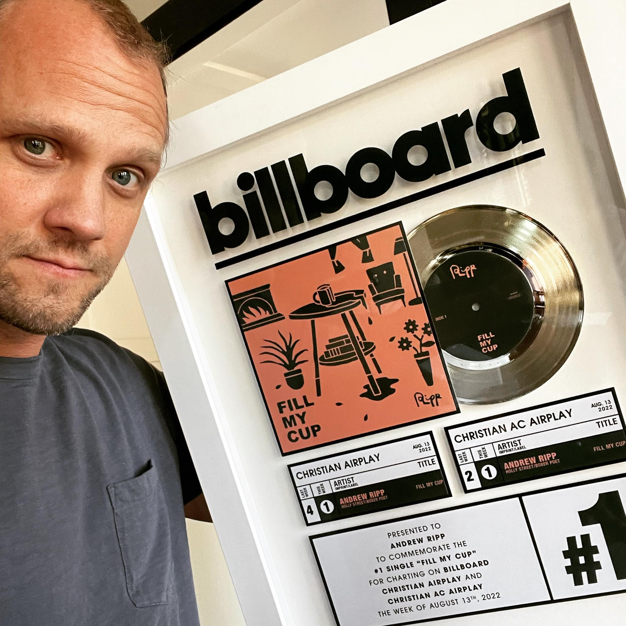 Nashville-based singer and songwriter Andrew Ripp announces that he has received a wall plaque for his single "Fill My Cup." The song hit #1 on both Billboard Christian airplay and AC Airplay charts earlier this year.