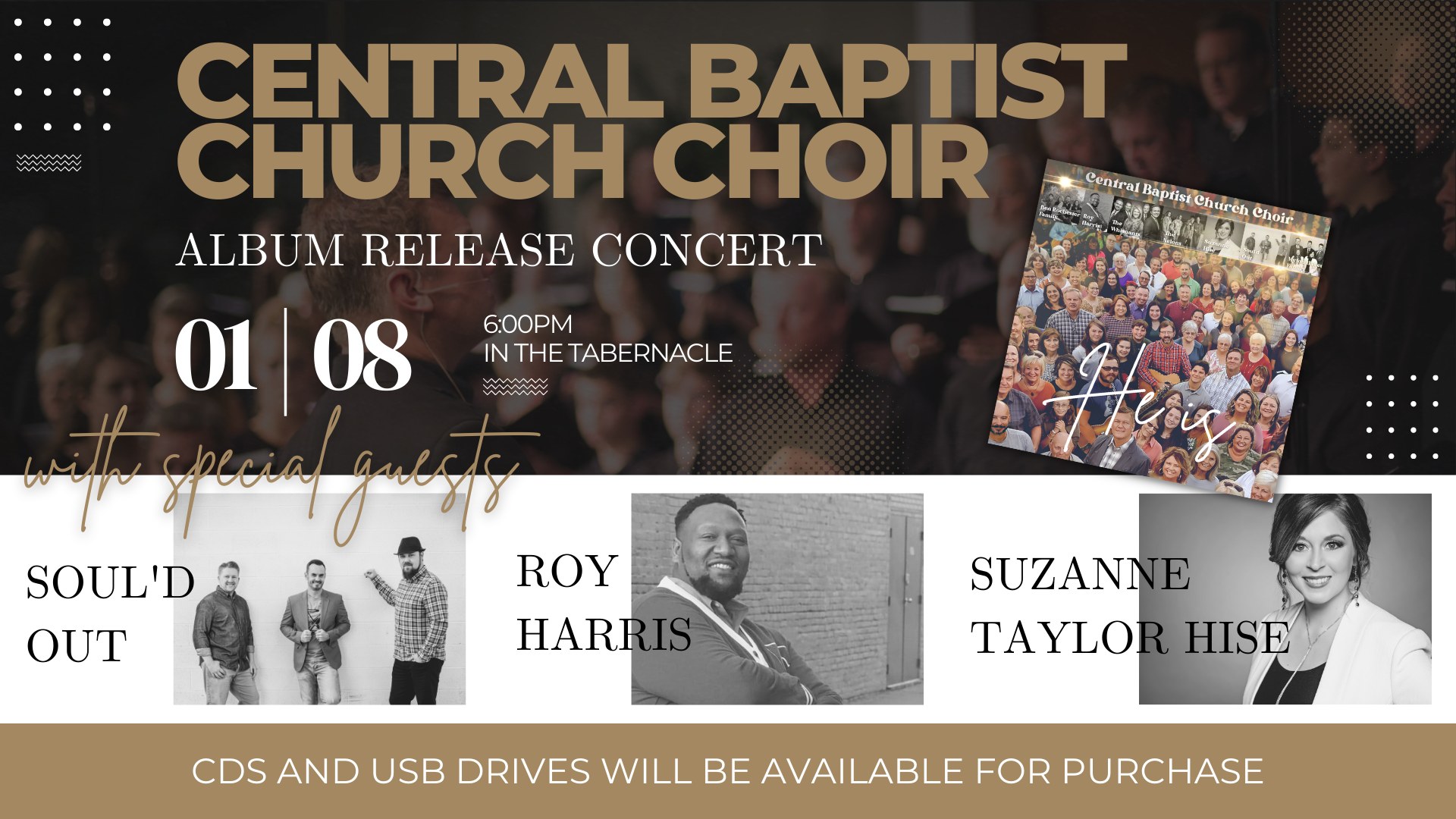 Since the mid-1980s, the Central Baptist Church Choir has been testifying of God's goodness singing His praises through a variety of music styles week after week in church services, events, concerts and radio. Having shared the stage with Greater Vision, Anne Wilson, Karen Peck & New River, The Nelons, The Mylon Hayes Family and many others has given them a unique platform to share the Gospel locally and abroad.