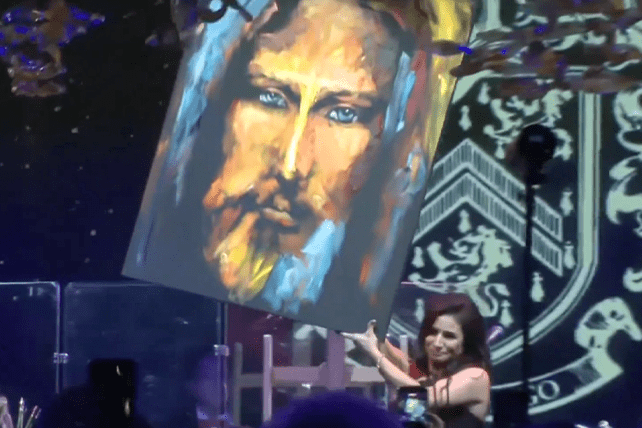 The artwork was painted onstage during the Dec. 31 event by Christian worship artist Vanessa Horabuena, who completed the piece in real time as worship music played for the gathered audience. Following the performance, President Trump personally led the auction, encouraging bids from attendees in the packed ballroom.